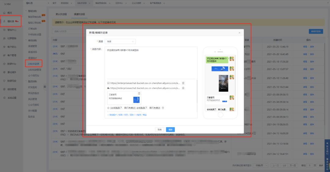 2、 新增:渠道活碼中涉及到的歡迎語功能單次可攜帶9個附件,并新增視頻附件功能,增加預覽功能