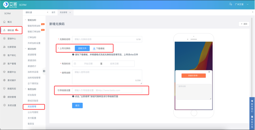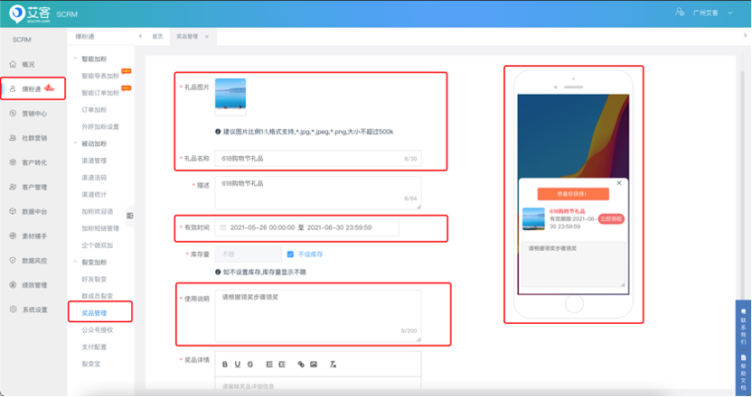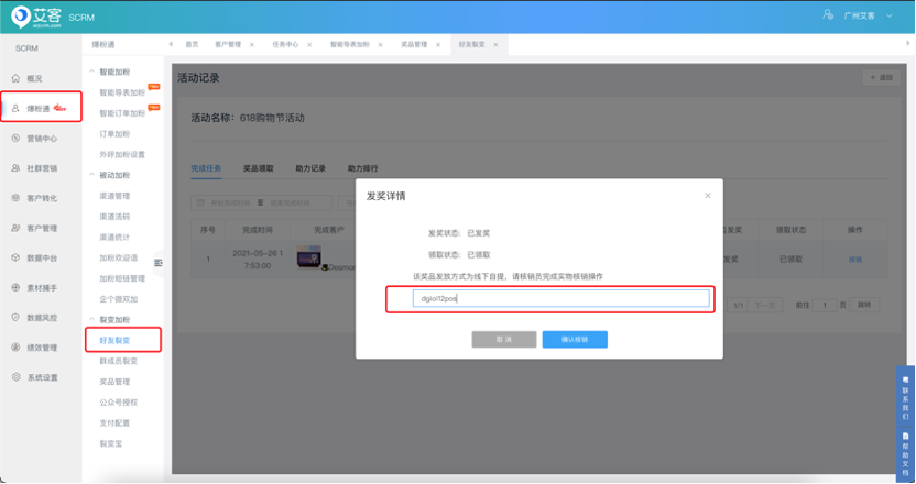 頁面路徑:爆粉通-裂變加粉-獎品管理