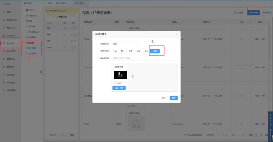 5、 新增:快捷回復新增小程序類型