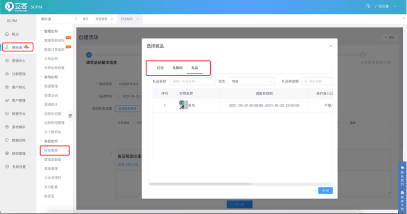 裂變活動獎品類型增加兌換碼、禮品選擇。可滿足不同的活動場景需要