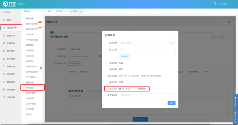 3、新增:裂變活動選擇禮品后,設置發獎方式(線下自提/物流發貨)