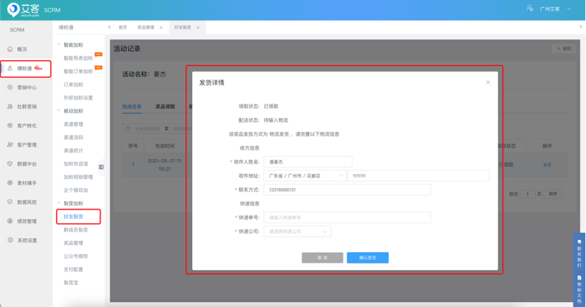 對設置活動中需【物流發貨】的禮品獎品進行發獎操作,同步用戶收件信息,錄入快遞單號及公司信息