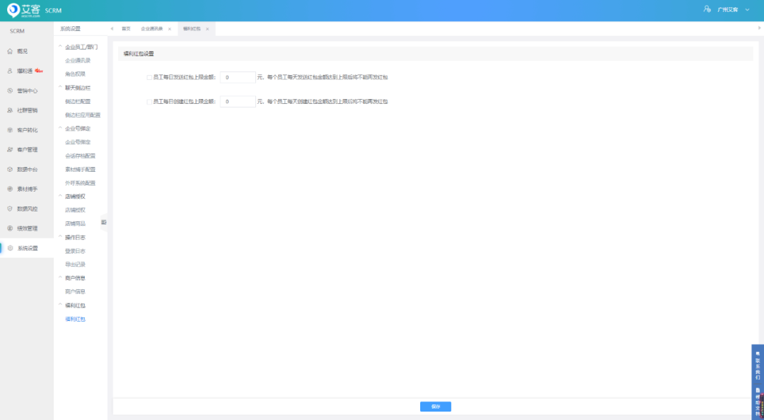 員工在客服端側邊欄使用紅包功能時,可在系統中社會員工創建紅包上限和發送紅包上限。當達到上限后,員工將不能創建/發出紅包。
