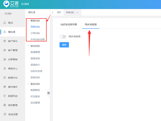 艾客scrm接入短信系統,設置好短信模板后,可應用在以下幾個場景 1.1、導表加粉、訂單加粉、外呼加粉,開啟短信通知后會對需要加粉的手機號先進行短信群發,可以有效提升加粉的通過率。