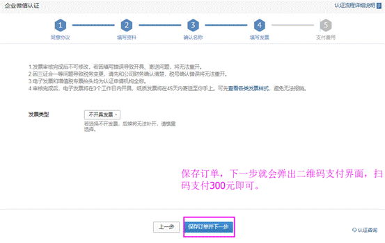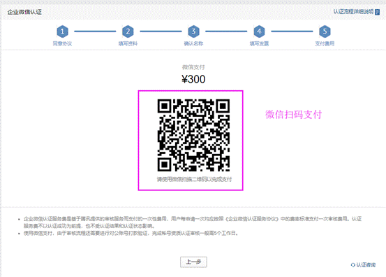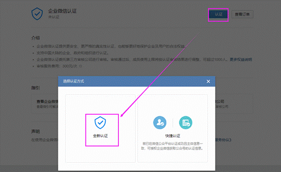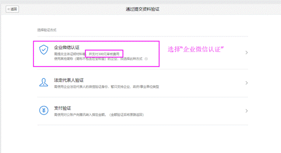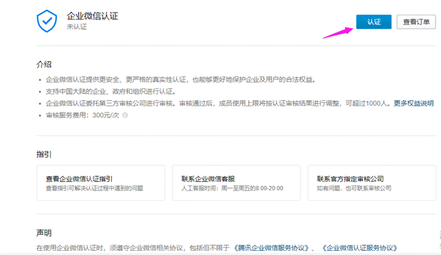 3)選擇“企業微信認證”,需要繳納300元審核費用