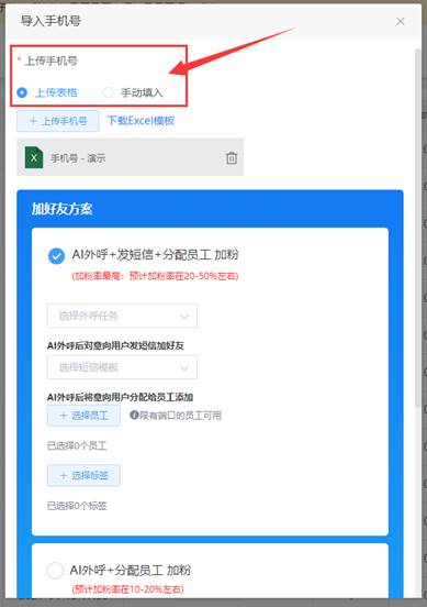 l AI外呼+分配員工加粉:是指會給導入的手機號進行AI智能外呼,用戶接到電話確定有加好友意向時,接著會將有意向的手機號分配給選中的員工,員工會收到實時提醒,要求員工實時去添加當前這個手機號為好友