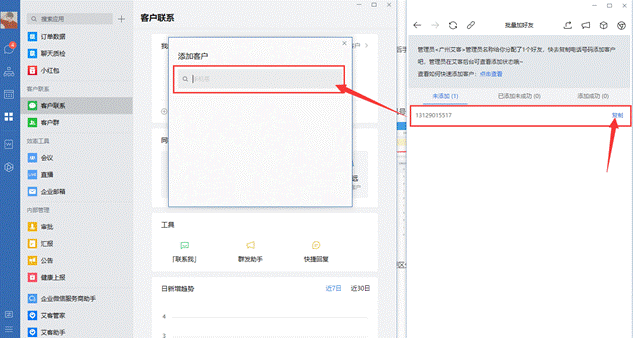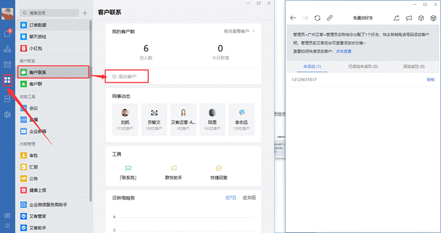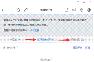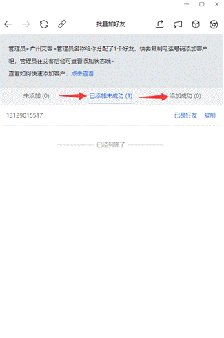 注:若這個手機號已是好友,員工可手動點擊“已是好友 ”按鈕,系統會查詢這個好友是否存在,若存在標記這個手機號未添加成功,