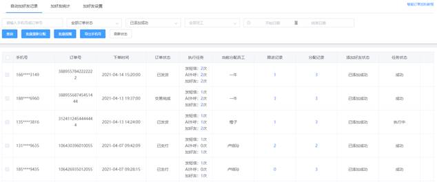 注:如果同一個手機號同時有多筆訂單時,之后對最早的一筆訂單執行加好友的動作,當這筆訂單的加好友任務全部結束后,且這個手機號沒有添加成功時。有同一手機號的訂單才會再次執行加好友任務。否則全部同手機號的訂單都將自動過濾。