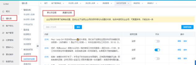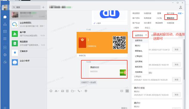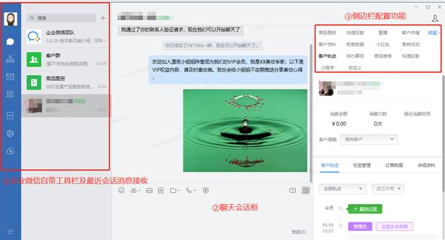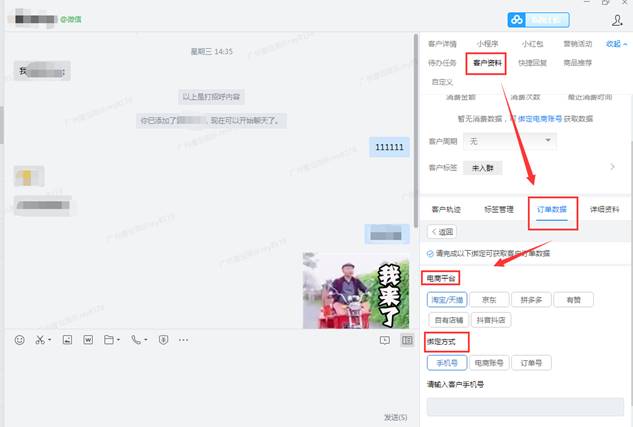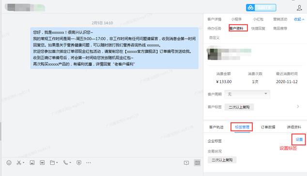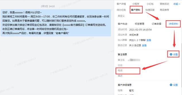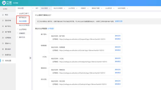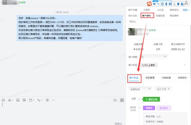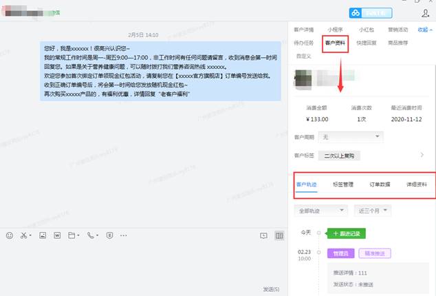 ②通過企微管家配置:(客戶資料、電商數據、小紅包、營銷活動、客戶軌跡、商品推薦、快捷回復)