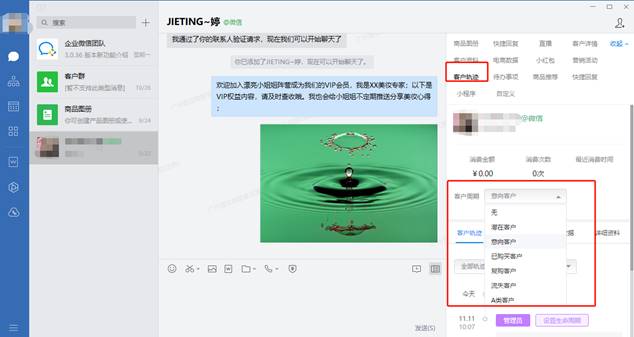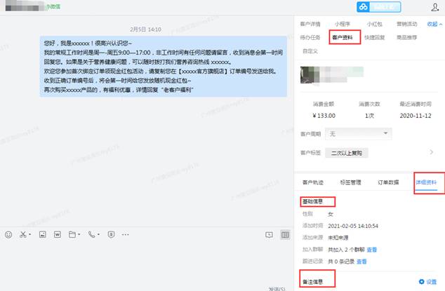 主要用于展示好友拓展信息內容,電商數據和互動信息展示對應數據,系統自動獲取客戶信息(如:客戶最近一次的購買時間、客戶最近一次的聊天時間等)便于商家分析客戶情況