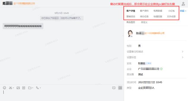 當員工和外部聯系人聊天時,在聊天窗右側打開的功能應用頁面。可以將企業的功能配置到側邊欄,方便員工獲取和操作客戶信息;