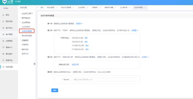 注意:配置該功能前,需聯系對應營銷顧問繳費開通企業微信會話存檔功能,如未開通則無法配置,具體可參考配置文檔(點擊查看配置步驟