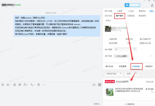 通過綁定粉絲的手機號或淘寶 ID 或訂單號,后期即可在客服端購物訂單查看對應粉絲的訂單明細