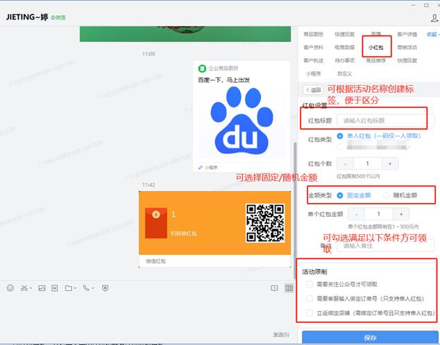 根據與對方客戶的溝通情況進行適當的紅包發送營銷,該紅包發送直接對接微信支付接口