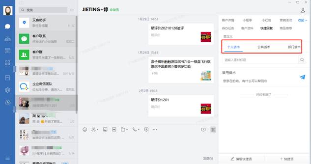 適合常用話術的快速調用回復,更加快速便捷,需要現在企微管家后臺設置好對應的快捷語(個人快捷語類型支持pc端新建)