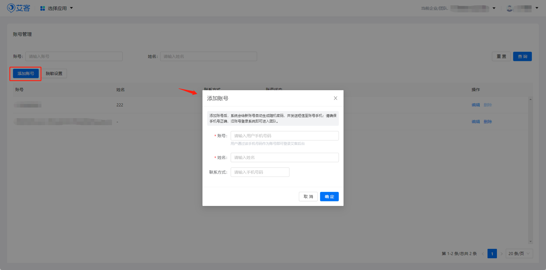 點擊添加賬號,輸入需要登錄艾客SCRM的成員手機號碼。