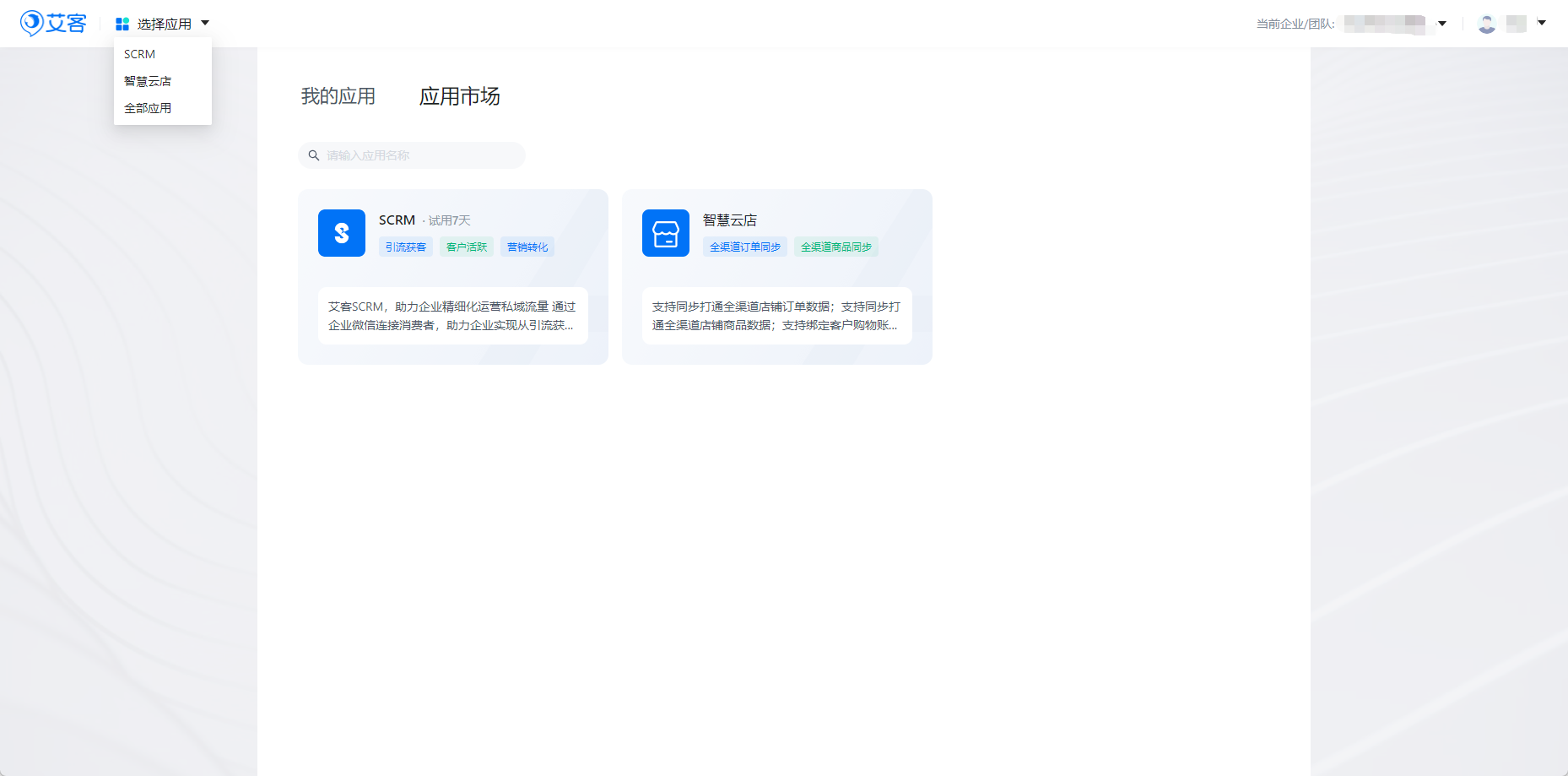 在【應用市場】頁面,點擊卡片進入詳情頁逐一開通SCRM和智慧云店應用。