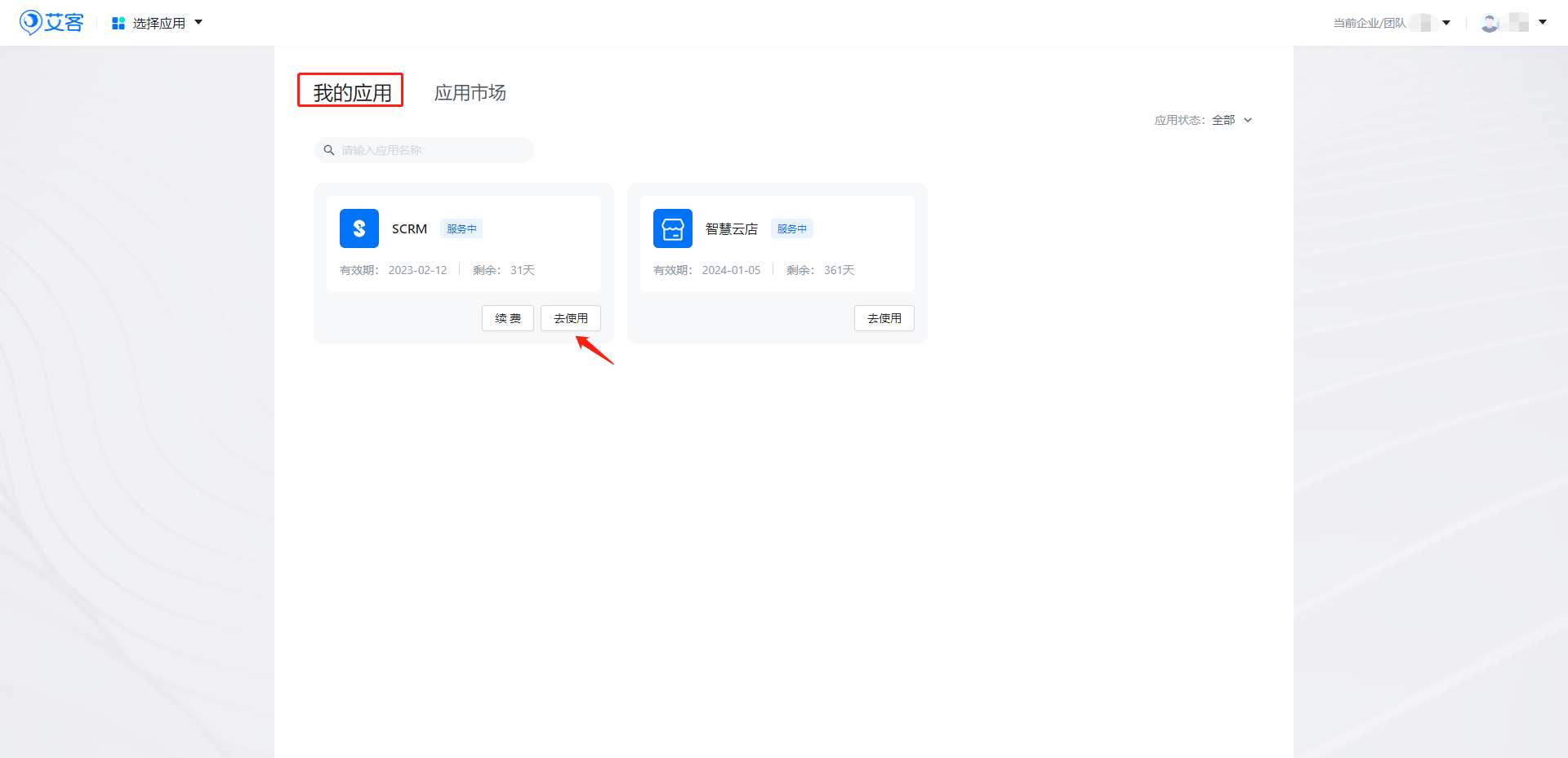 也可以在【我的應用】頁面,點擊“去使用”按鈕,進入SCRM。