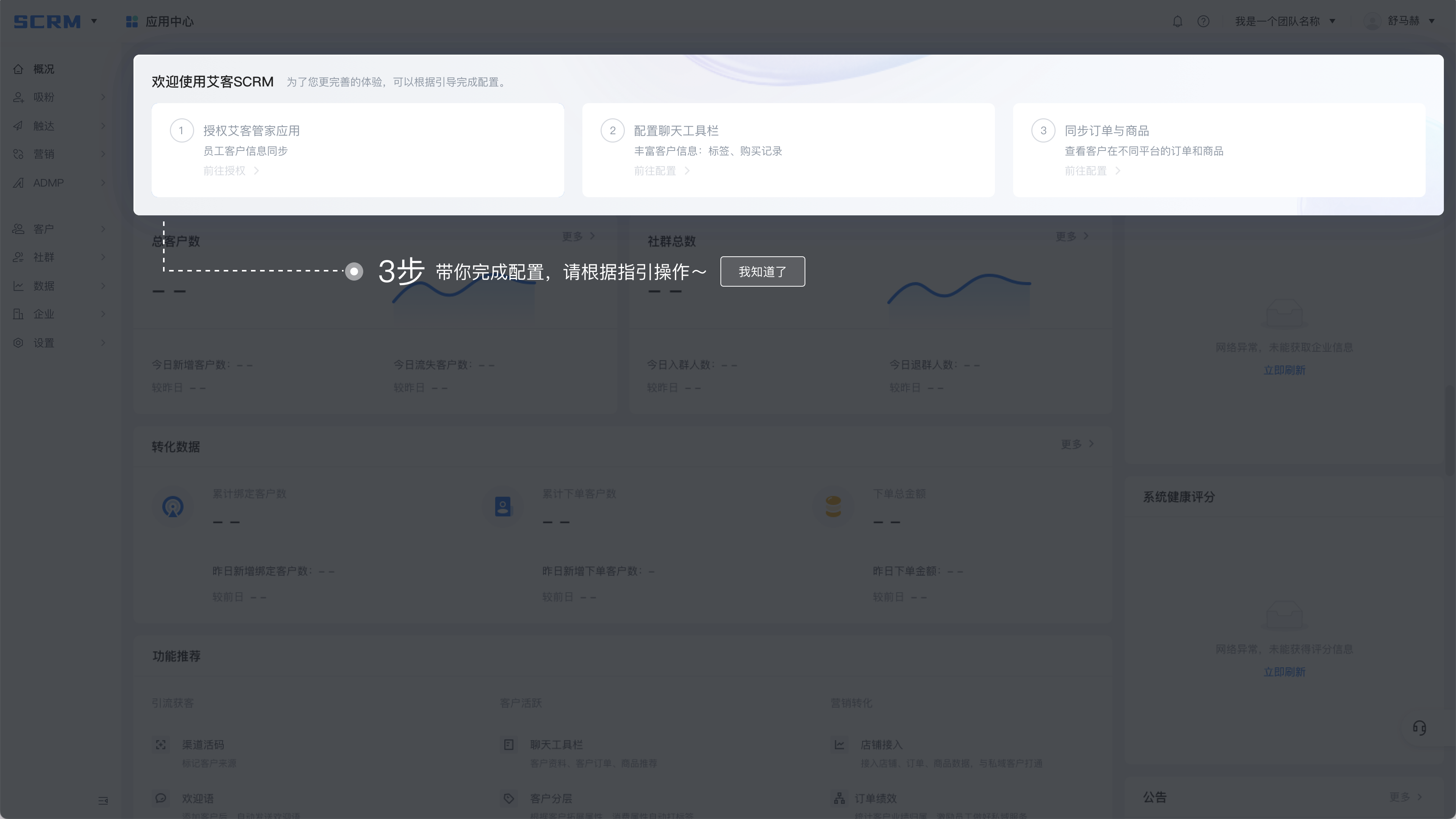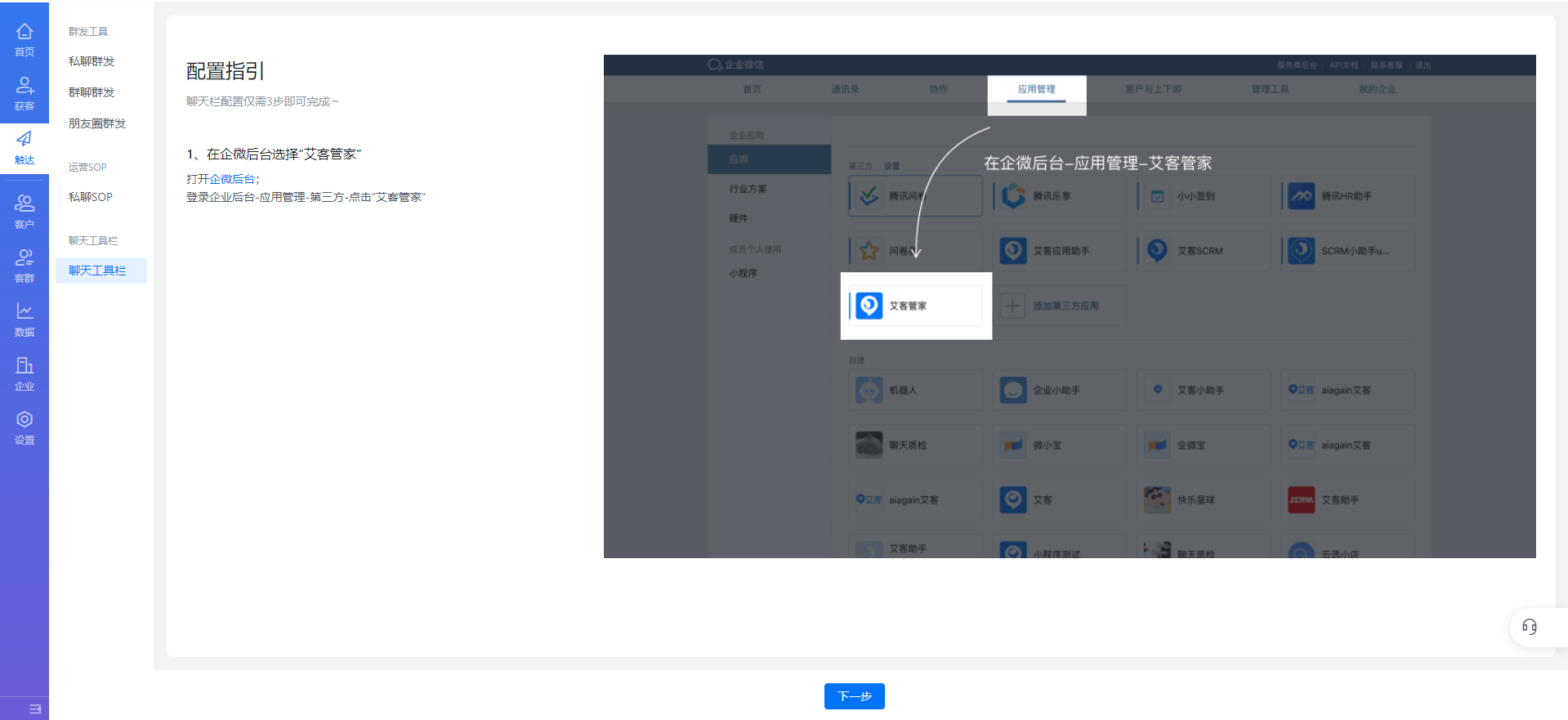 首次使用艾客SCRM,企業微信超級管理員請根據頁面指引,完成配置。