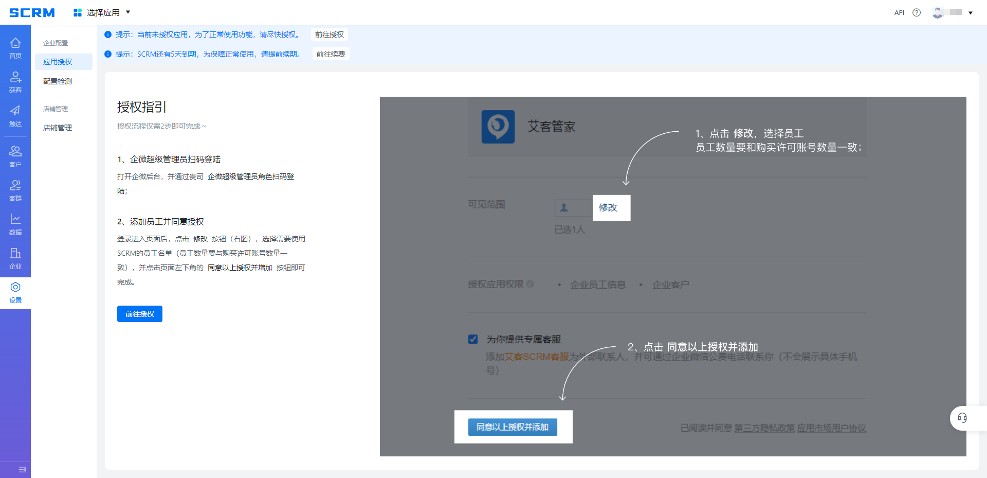 授權艾客管家應用,以便同步企業微信的員工、客戶數據,快速投入業務運營使用。