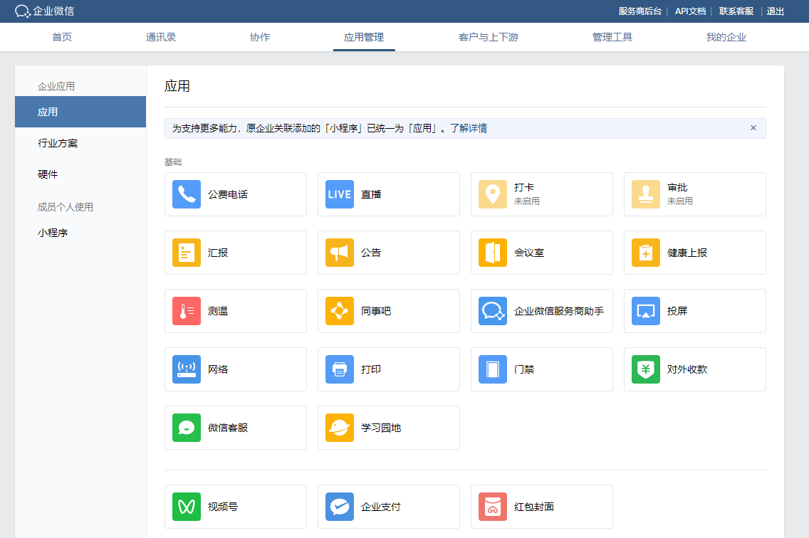 8、工作臺應用管理權限:登錄企業微信管理后臺,在【應用管理】-【應用】中,盡可能把應用都開啟,增加企業微信權重
