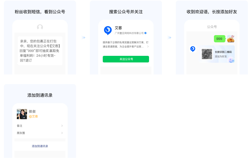 淘寶站內(nèi)短信可觸達下單用戶,可通過文字引導(dǎo)用戶關(guān)注公眾號再添加企微。