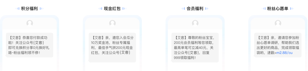 淘寶短信可以用于通知用戶積分福利、現(xiàn)金紅包、會員福利和粉絲心愿單等活動。