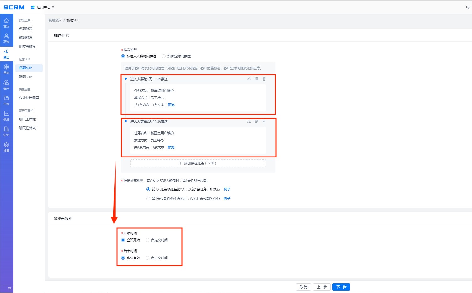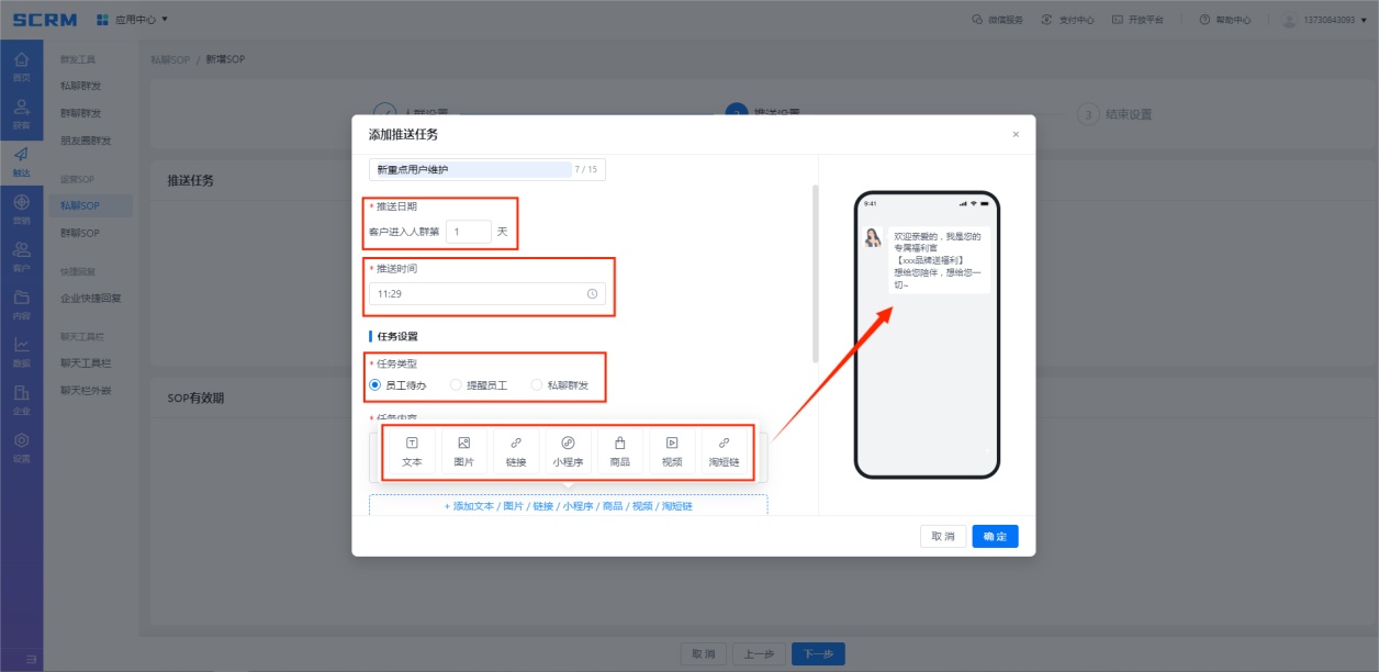 通過設置客戶運營計劃,對進入不同人群包的客戶進行針對性、精準化的營銷。通過【人群設置】選擇運營計劃針對的目標用戶人群以及執行計劃的員工;【推送設置】編輯員工需推送的運營內容(包括文本、圖片、鏈接、小程序、鏈接、商品、視頻、淘短鏈)及推送日期及時間,員工將在指定時間收到系統下發的推送任務(包括員工待辦、提醒員工、私聊群發);最后【結束設置】選定運營計劃結束方式,并設置完成運營計劃的用戶是否進入新的人群包及運營計劃。