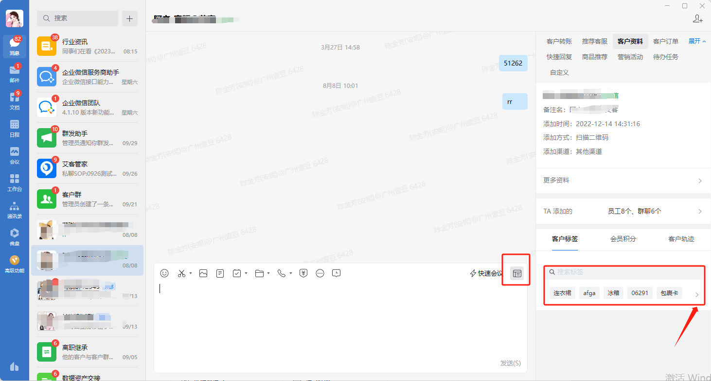 ②手動打標的方式:在企微側(cè)邊欄進行手動選擇標簽