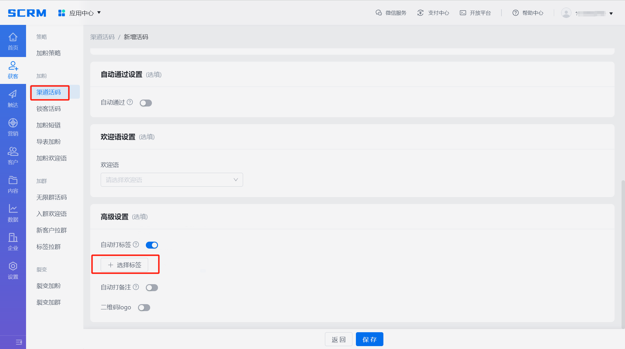 1)活碼自動打標:設(shè)置活碼的時候,選擇關(guān)聯(lián)標簽