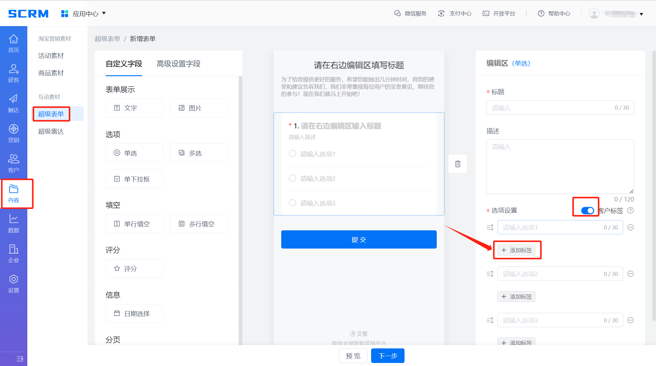 2)超級表單自動打標:表單收集客戶基本情況,可以通過客戶選擇對應選項,進行打標