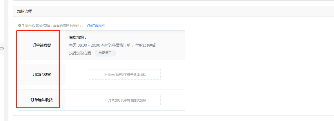 企業(yè)加好友的訂單狀態(tài)有三種:代發(fā)貨、已發(fā)貨、確認(rèn)收貨,企業(yè)可以開(kāi)啟一種或者多種狀態(tài)下去加好友。當(dāng)某個(gè)狀態(tài)加好友成功之后,系統(tǒng)會(huì)自動(dòng)終結(jié)下一階段的加好友任務(wù)。當(dāng)加粉成功后,系統(tǒng)自動(dòng)給客戶打上對(duì)應(yīng)標(biāo)簽。在加好友設(shè)置過(guò)程中,企業(yè)可以設(shè)置執(zhí)行加粉的時(shí)間段、分配加粉員工。