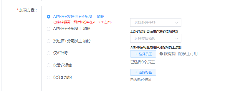 1、AI外呼+發(fā)短信+分配員工加粉