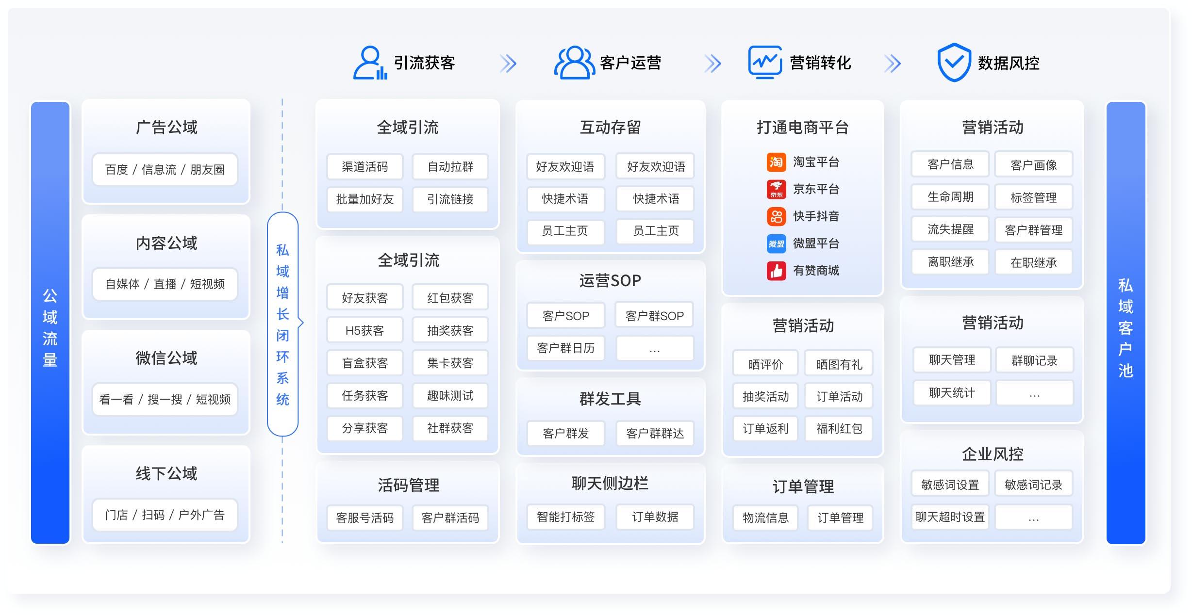 企業微信本身也自帶運營功能,但比較基礎,推薦使用艾客的企業微信運營功能,艾客是一款功能齊全又細致的企業微信營銷工具。從引流獲客、客戶運營、營銷轉化、數據風控打造企業私域營銷閉環。