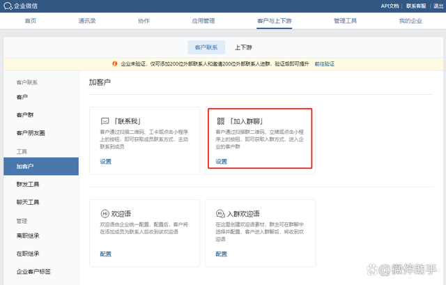 企業(yè)微信群活碼創(chuàng)建:打開企業(yè)微信后臺,先是從“客戶與上下游”中的“加客戶”選擇“加入群聊”再點擊“創(chuàng)建群聊”選擇“通過二維碼加入群聊”,就可以生成群活碼,如下圖所示: