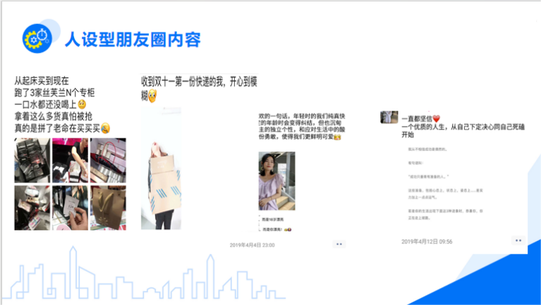 人設(shè)型朋友圈運用于前期打信任基礎(chǔ)時,人設(shè)型內(nèi)容可以占朋友圈內(nèi)容大比例,后續(xù)進入穩(wěn)定階段后可減少。人設(shè)型朋友圈的核心在于你的定位越精細,你的內(nèi)容越落地,讓粉絲相信你的確是這樣的人,增加你與他們之間的情感鏈接。發(fā)布的策略在于360度無死角地重復(fù)用故事形式對自己形象進行展示。