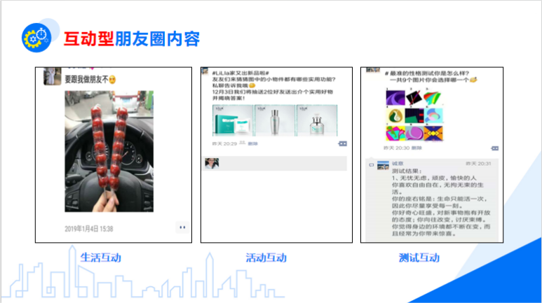 互動型朋友圈利用隨時隨地的互動,不僅在自己朋友圈做互動并且在用戶朋友圈互動,讓粉絲培養(yǎng)閱讀習(xí)慣并且制造可互動聊天的點。搭建互動型朋友圈前期要設(shè)置帶利益點的專欄內(nèi)容培養(yǎng)用戶的閱讀習(xí)慣,例如一定量的禮物贈送,后續(xù)視朋友圈活躍情況降低涉及相關(guān)利益點的部分,但需要注意的是,贈送禮物本質(zhì)上不是利益吸引,而是在于朋友圈的內(nèi)容價值上,讓用戶產(chǎn)生認知。