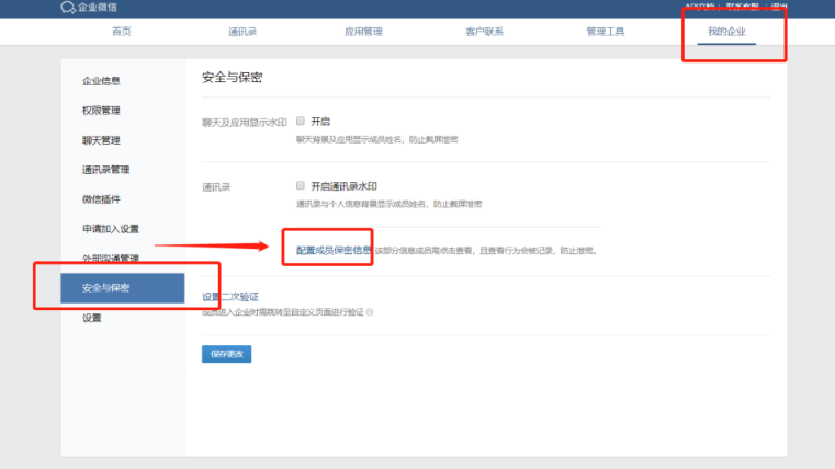 我們登陸企業微信后臺,可在【安全與保密】—【配置成員保密信息】中進行成員保密信息設置,設置好后,一旦成員點擊查看信息就會有記錄。