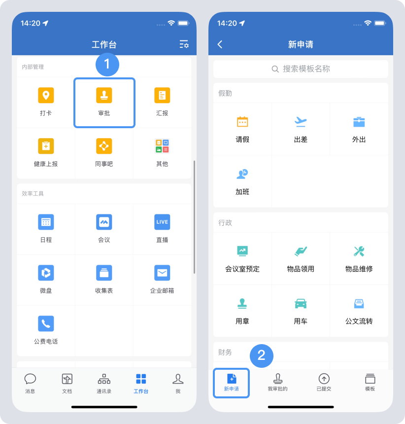 手機端:在“工作臺”——“審批”——“新申請”