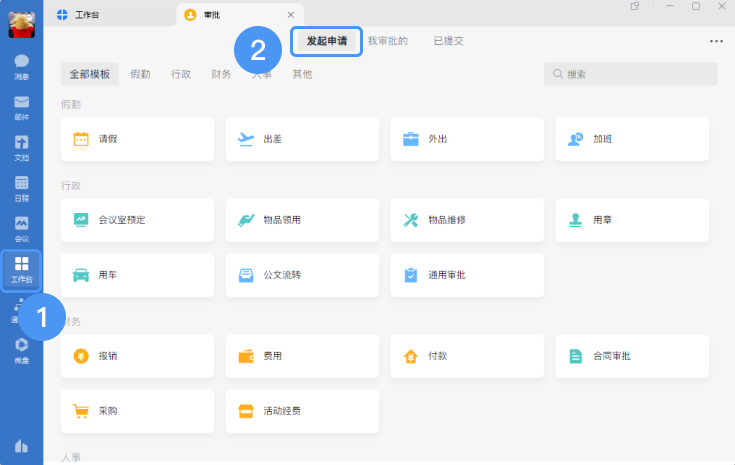 PC端:登錄PC端企業(yè)微信后,在“工作臺”——“審批”——“發(fā)起申請”