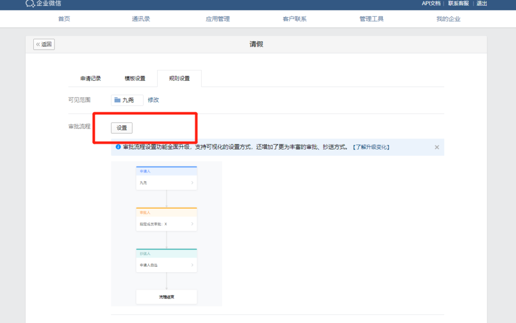 企業(yè)微信管理者進入企業(yè)微信管理后臺,在“應用管理”——“審批”——“設置”,設置好相對應的規(guī)則,規(guī)則里可以設置固定的審批人以及抄送人。