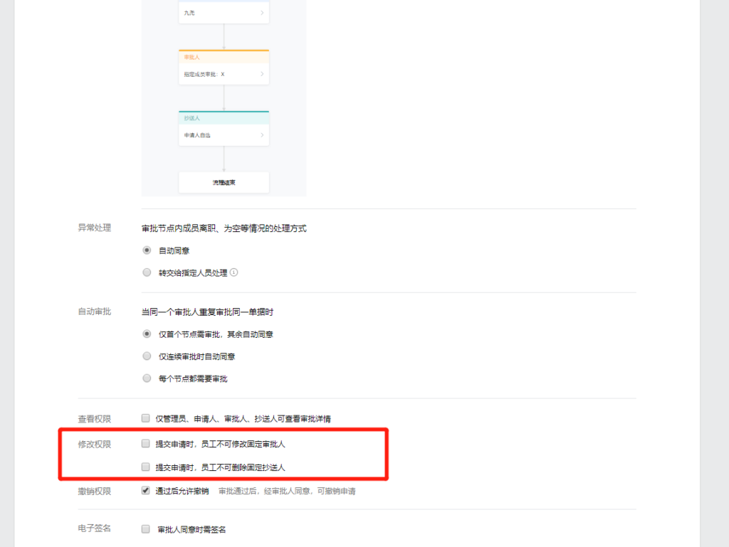 對異常處理、自動審批、查看權限、修改權限、撤銷權限、電子簽名方面都有對應的選擇,企業(yè)可根據(jù)自身情況進行選擇即可。