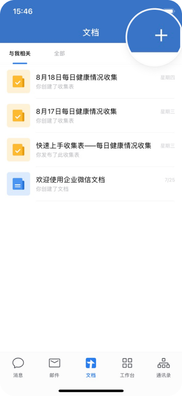 A、手機(jī)端登錄企業(yè)微信,在底下工具欄中點(diǎn)擊“文檔”——進(jìn)入文檔頁面之后點(diǎn)擊右上角的“+”,就可以創(chuàng)建新文檔了。