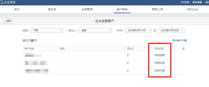 管理員進入企業微信后臺能輕松查看客戶信息,在【客戶聯系】中點擊【客戶】按鈕,就能在“查看客戶列表”中瀏覽企業全部客戶數據。如果需要針對特定客戶進行查詢,能夠通過添加員工、時間范圍、客戶標簽等條件進行篩選。
