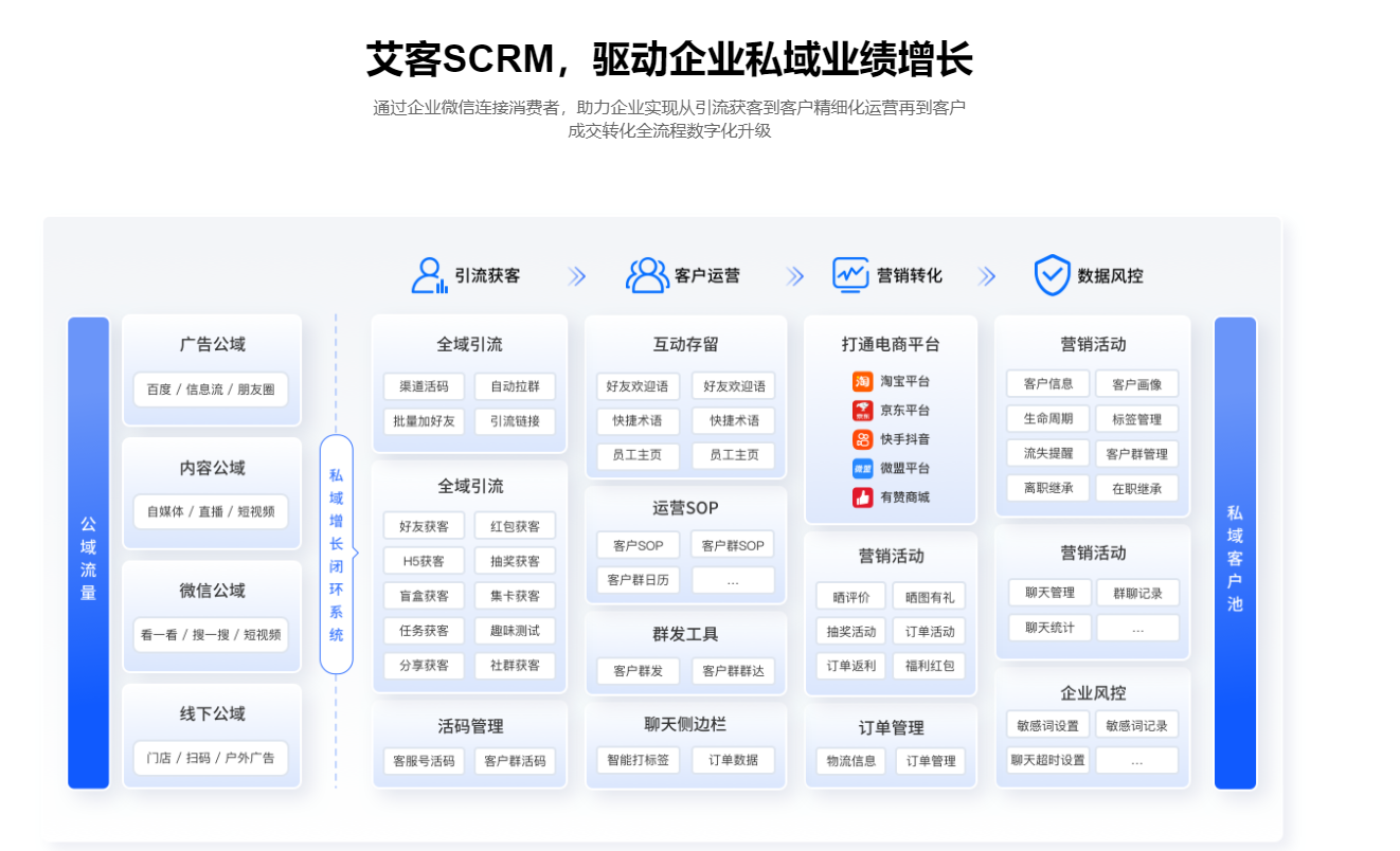 關(guān)于企微營銷系統(tǒng)哪個(gè)好?這里小艾推薦大家使用企業(yè)微信服務(wù)商——艾客SCRM系統(tǒng)。艾客深耕于做私域7余年,具備豐富的經(jīng)驗(yàn),服務(wù)來自全國各地超1000+企業(yè)、品牌商,幫助其高效精細(xì)化運(yùn)營私域,有效提升營收額,獲得眾多企業(yè)的認(rèn)可及青睞。構(gòu)建從引流獲客、私域留存、營銷轉(zhuǎn)化、數(shù)據(jù)風(fēng)控等全方位打造私域營銷閉環(huán)。