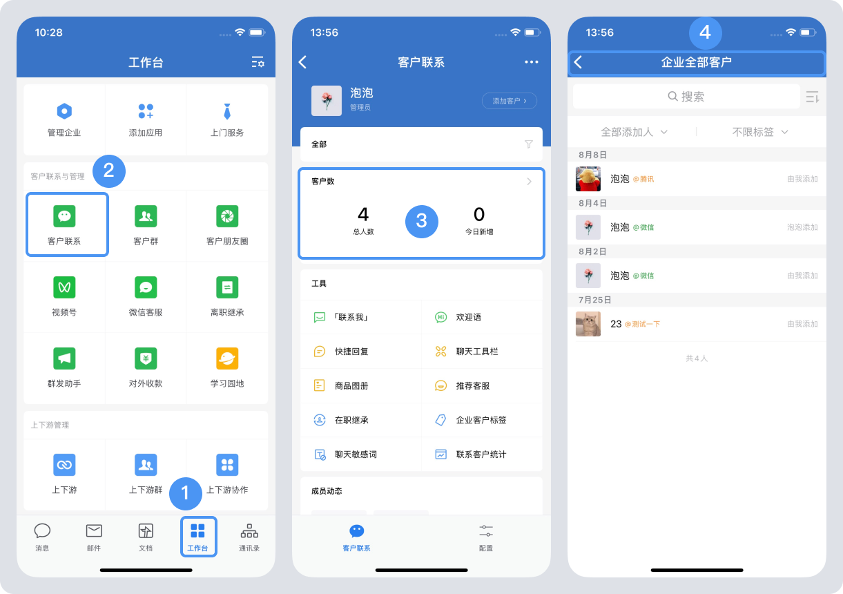 手機端查看企業客戶資料步驟:企業微信管理手機登錄企業微信,“工作臺”——“客戶聯系”——“客戶數”——“企業全部客戶”。