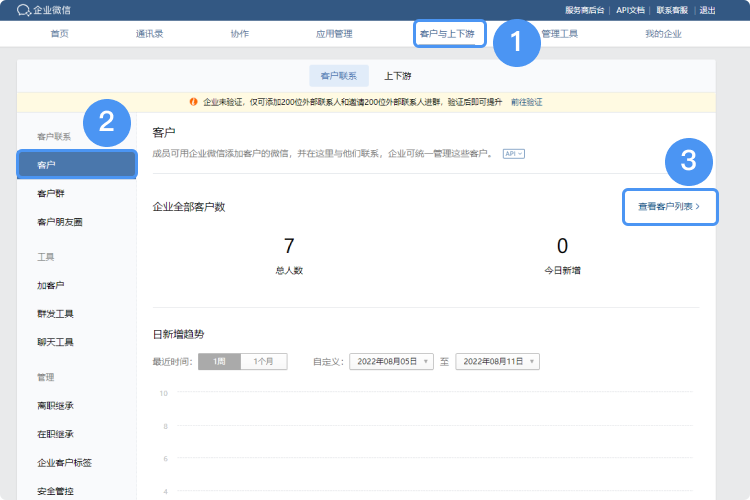 企業微信后臺查看企業客戶資料步驟:企業微信管理員登錄企業微信管理后臺,在“客戶與上下游”——“客戶”——“查看客戶列表”,就可以查看所有的企業客戶了。
