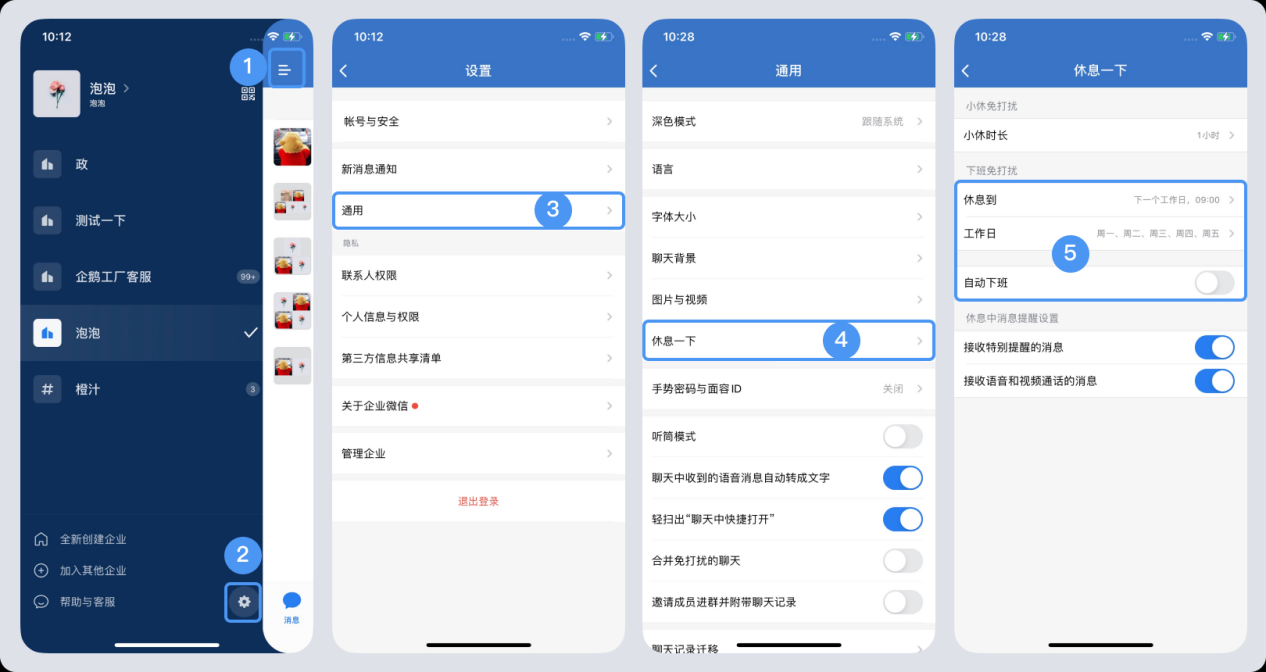 3、把“休息一下”狀態(tài)進(jìn)行關(guān)閉。登錄手機(jī)端企業(yè)微信,“三橫杠”——右下角“設(shè)置”——“通用”——“休息一下”——關(guān)閉“自動下班”。