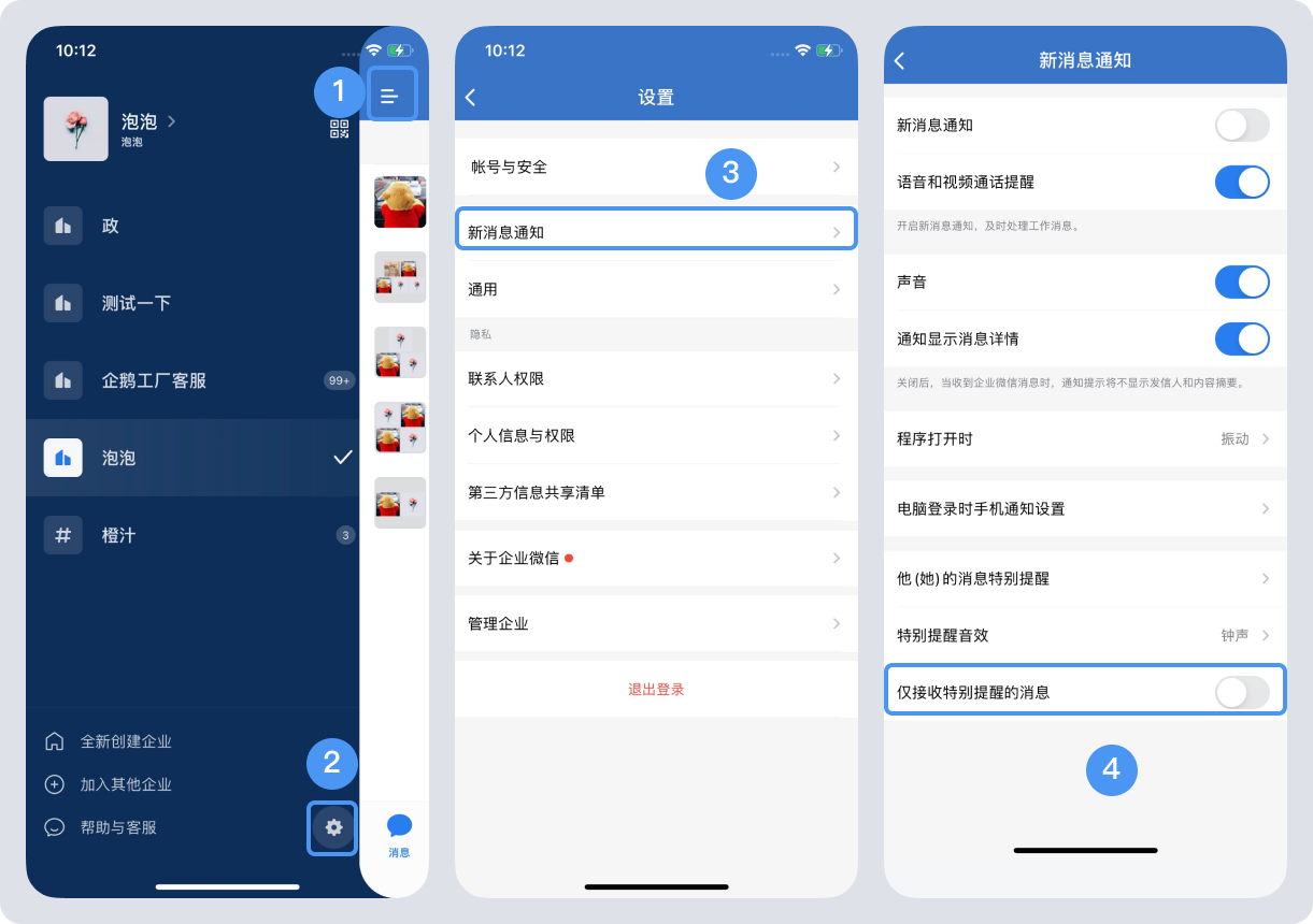 4、關(guān)閉“僅接收特別提醒的消息”,登錄手機(jī)端企業(yè)微信,“三橫杠”——右下角“設(shè)置”——“新消息通知”——關(guān)閉“僅接收特別提醒的消息”。