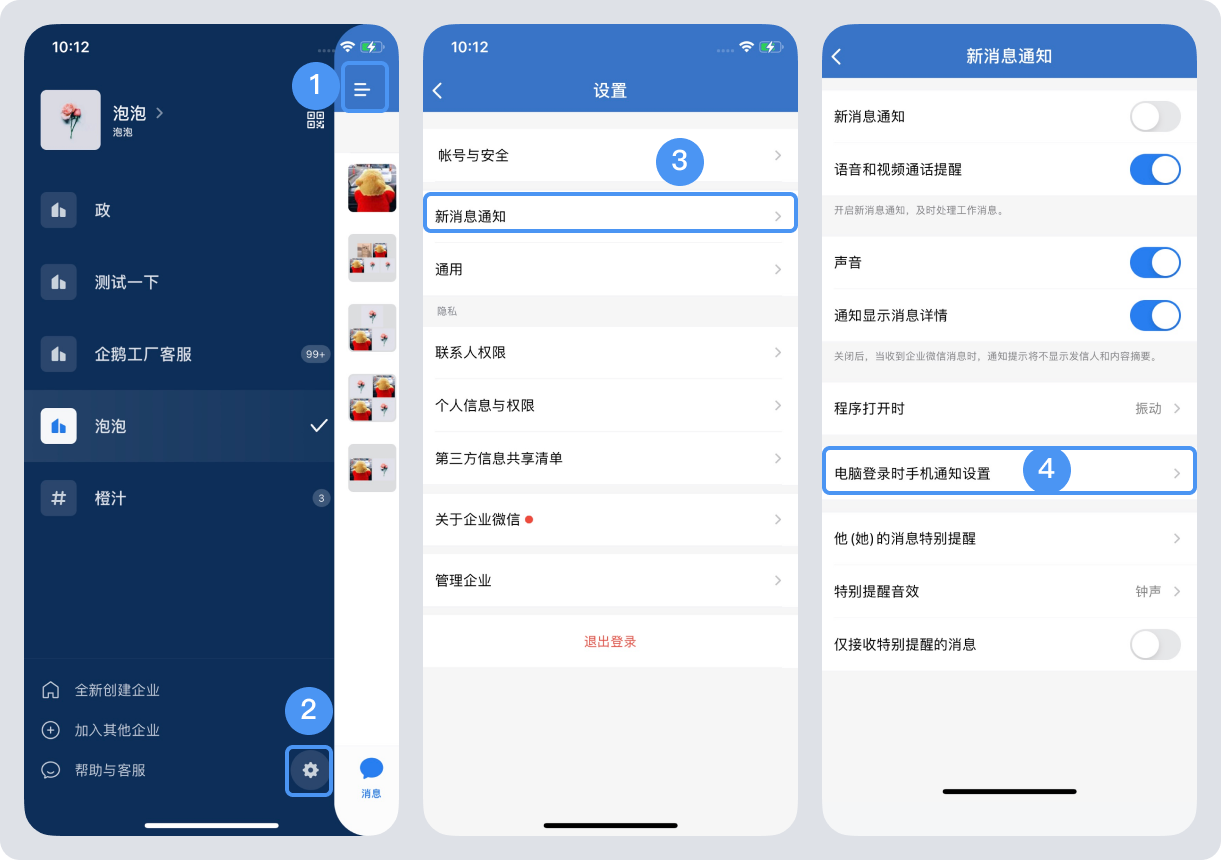 2、電腦端企業(yè)微信接收消息需要在手機(jī)端設(shè)置開啟“手機(jī)始終接收通知”,步驟:“手機(jī)端”——“三橫杠”——右下角“設(shè)置”——開啟“電腦登錄時(shí)手機(jī)通知設(shè)置”。